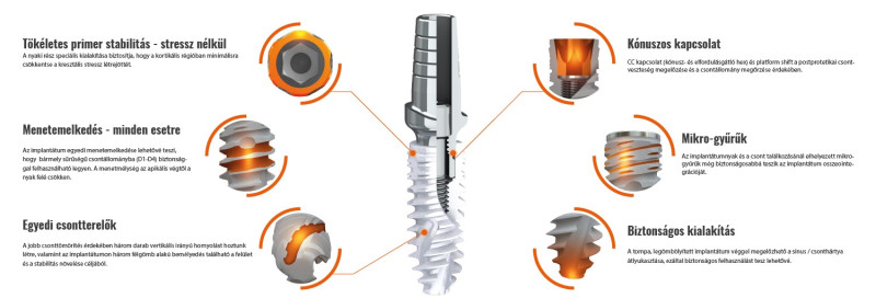 Sűrű menetemelkedésű implantátum, rendkívül előnyös a kemény csontállományhoz (mandibula, D1 és D2) – főként alsó állcsontba, Shift platformmal és Conical Connection kúpos csatlakozással.